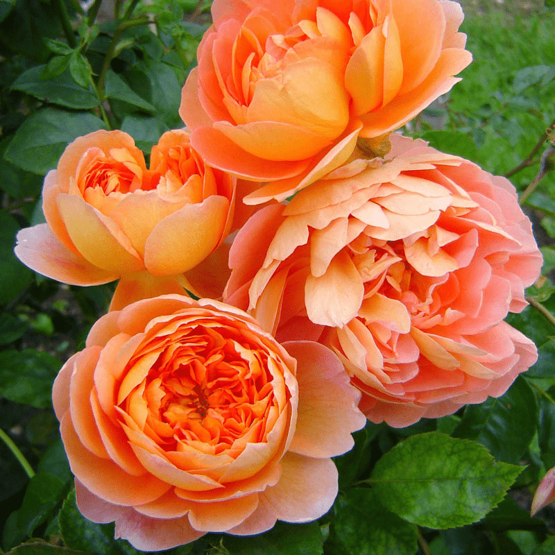 - Leander (Леандр). Остиновские розы, вырастающие до 150-180 см высотой и до 150 см в обхвате. На фоне блестящих зеленых листьев контрастно выделяются кисти, формирующиеся из 5-10 штук небольших ярко-абрикосовых бутонов. Леандр считается однократно цветущим, хотя одиночные цветки могут появляться и позже.