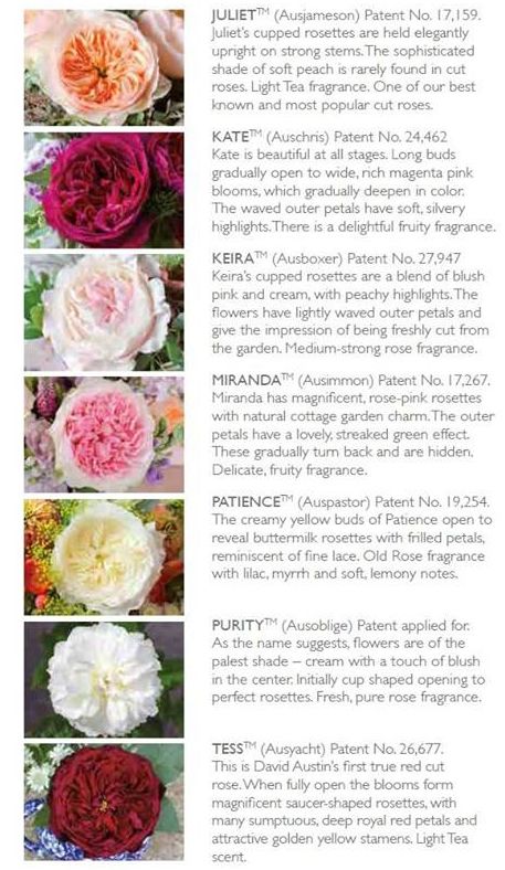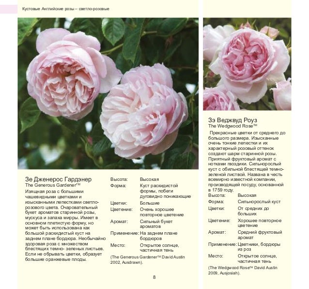 Все они отличаются пленительной красотой, крупным широким бокалом, красивым кустиком, устойчивостью к болезням, а чарующий аромат стал их визитной карточкой..Английские розы внешне похожи на старинные сорта – дамасские, бурбонские, галльские, альбу, но имеют богатую палитру окрасок, способны расти на бедной почве, и устойчивы к неблагоприятным условиям выращивания. При всей своей ностальгически-старомодной внешности розы Дэвида Остина обычно цветут повторно или непрерывно и унаследовали от английских предков нетребовательность к освещению – им вполне хватает 4-5 часов солнечного света в сутки…Все сорта роз Дэвида Остина отличаются сильным приятным ароматом. Вы не найдете в коллекции, насчитывающей более 200 сортов ни одного цветка без запаха. Но «Джуд зе Обскур» считается розой с самым сильным запахом, способным поспорить даже с ароматом французских духов…Если высота кустика имеет значение и есть возможность, прежде чем высаживать розы Остина поинтересуйтесь их размерами у садоводов, проживающих в вашем регионе, а не полагайтесь на описание в каталоге.![]()