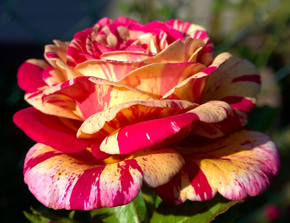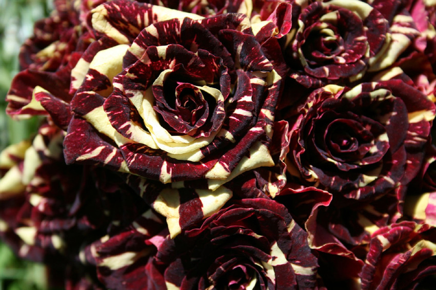 Растением с одной из самых поразительных расцветок является роза сорта «Абракадабра». Данный цветок с крупными бутонами, которые даже могут образовывать соцветия в процессе роста, сочетает в себе такие цвета палитры, как темно-красный, коричневый, а также бежевый. Особенностью растения является то, что окрашены бутоны неравномерно, что придает им пестрый, нарядный и необычный облик. Высота куста в среднем имеет показатель 0,7 метра, при этом он обладает темно-зелеными листьями и бутонами с заостренными концами диаметром 12 сантиметров.
