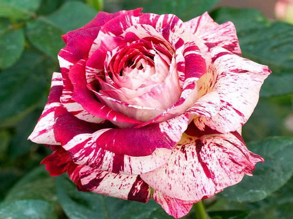 Весьма контрастным двухцветным сортом является чайно-гибридная роза «Осирия». Каждый лепесток ее бутона сверху окрашен красным, а остальная часть – белым. В результате букет с такой окантовкой выглядит чарующе. Несмотря на то что высота куста обычно ограничивается 70-80 сантиметрами, бутоны являются весьма крупными в диаметре – от 12 до 16 сантиметров.