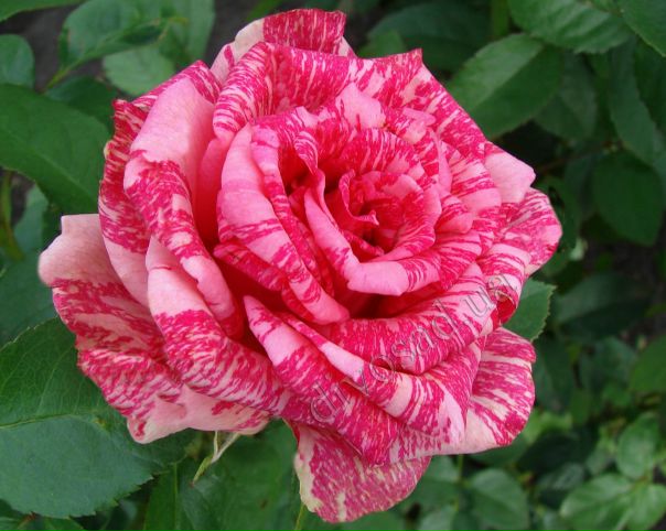 Глубокий розовый пестрый белый цвет Барта Кольбера.Большой полу-двухместный. Средний прямостоячий рост. Средний сезон. 1979 — Саванна, Джорджия