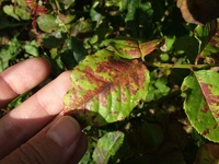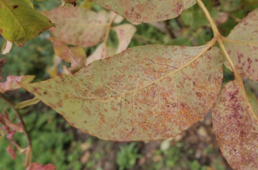 Желтые пятна на верхней поверхности листьев с соответствующими порошкообразными пятнами от оранжевого до черного на нижней поверхности листьев типичны для роз Робин Робертс, UW-Madison Plant Pathology
