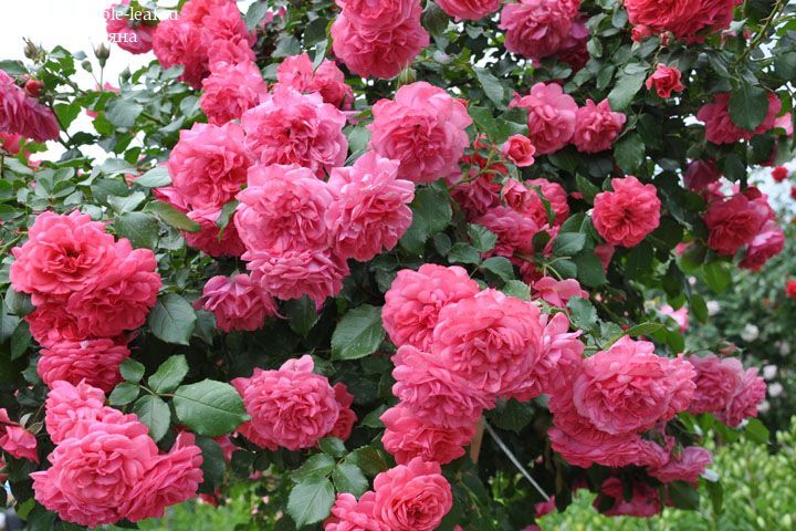 В Японии она стала известна как «Soukara-Ibara», а в Китае — «ShiTz-mei», что в переводе означает «десять сестер». В 1886 году во Франции культивар появился как Rosaplatyphylla. А спустя несколько лет он попал в питомник Тернера и в 1894 году продавался уже под названием «Terner’s Crimson Rambler».Цветки плетистой розы «Crimson Rambler» диаметром около 3-4 см, махровые (40-50 лепестков), огненно-карминно-красного цвета, затем с синеватым оттенком, не выгорают на солнце, не имеют запаха, собраны в крупные пирамидальные соцветия по 40-50 штук. Это высокорослый кустарник, побеги которого покрыты светло-зелеными, кожистыми листьями и достигают 3,5-5 м в длину. Цветение розы сорта «Crimson Rambler» очень пышное и продолжительное, до 35 дней, однократное.Плетистая роза «Crimson Rambler» отличается сильным ростом и способна быстро покрывать большие поверхности, хорошо чувствует себя у южных стен дома, однако выносит и легкую полутень. Для этой розы подойдут плодородные, легкие, нейтральные или слабокислые, задерживающие влагу почвы. Сорт устойчив к неблагоприятным погодным условиям и заболеваниям, но может поражаться мучнистой росой. Зимует под укрытием при температуре — 29 градусов. Роза «Crimson Rambler» очень быстро оплетает перголу и идеально смотрится с белыми, красными, синими и фиолетовыми соседями, посаженными у подножия или перед розой. Вьющиеся растения — подходящие спутники однократноцветущей розы. Это могут быть, например, клематисы или повторноцветущие розы. - Роза Excelsa ( Эксельза)«Excelsa» — это самый надежный сорт плетистой розы для условий средней полосы России. Мелкие, диаметром 3см, ярко-малиновые, густомахровые (70-90 лепестков), стойкие цветки появляются в плотных соцветиях по 40 штук.Кусты розы «Excelsa» очень сильнорослые (до 4 м), с тонкими, стелющимися побегами, покрытыми темно-зелеными, блестящими листьями. На высокую зимостойкость, неприхотливость и обилие ярких ароматных цветков приходится единственный недостаток — всего одна волна цветения в течение 30-35 дней.