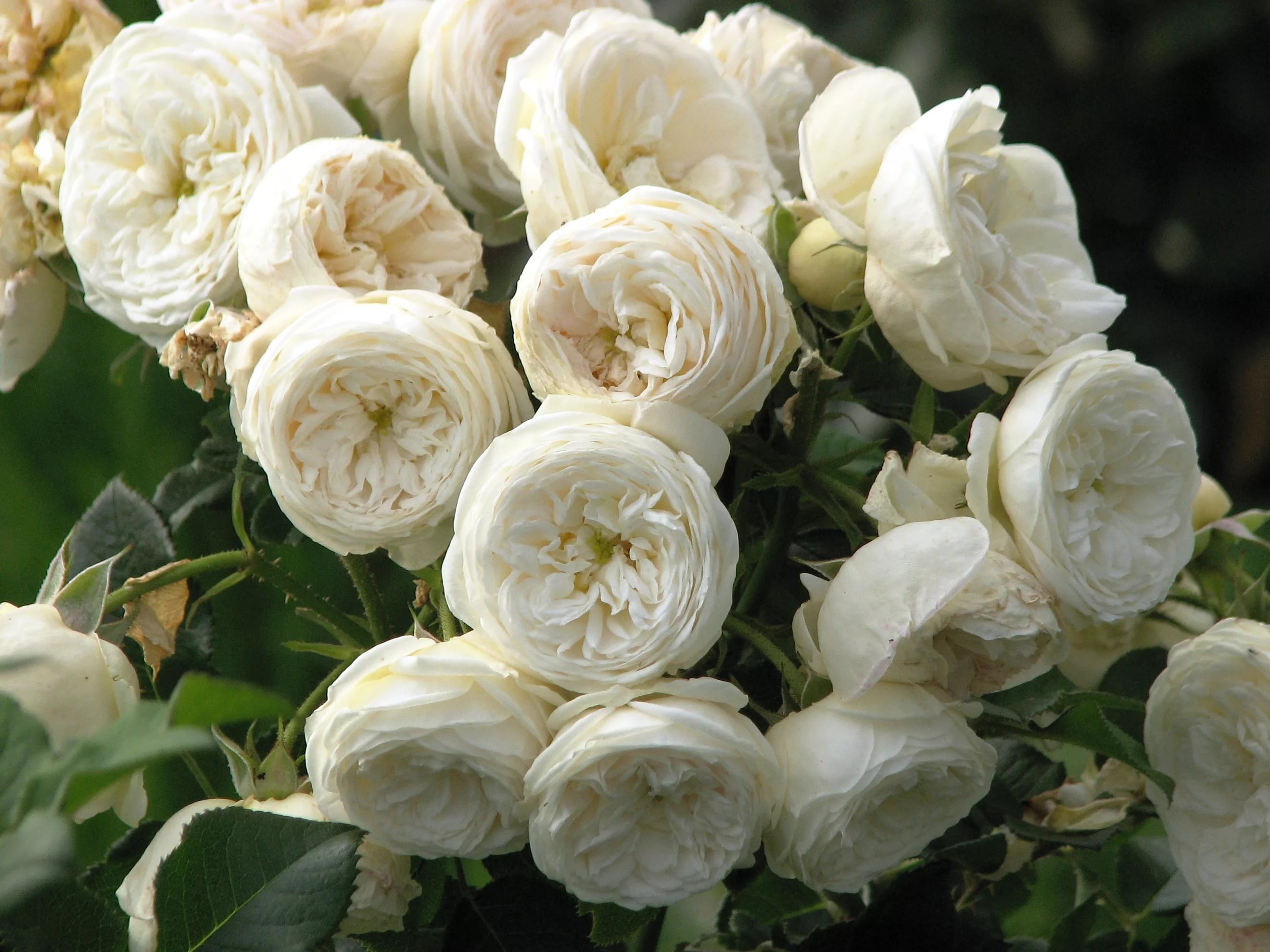 - Felicite et PerpetueСорт плетистой розы Felicite et Perpetue — один из лучших белых рамблеров, самый известный из гибридов Sempervirens. Цветки густомахровые (35-40 лепестков), 3,5 — 4 см в диаметре, имеют форму аккуратных розеток с пуговкой в центре появляются в крупных, рыхлых кистях по 20-40 штук.