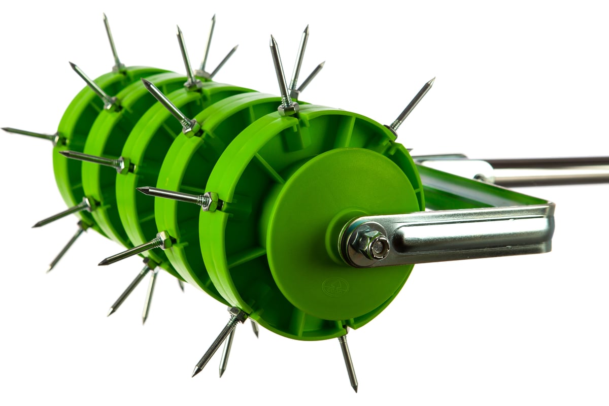 Механический или ручной аэратор, так же как и сандалии, — это отличный аэратор для участков до 6 соток. На горизонтально расположенном валике установлены шипы, проникающие в почву. Разумеется, идеально вертикального вхождения шипа в землю не будет, так как входить и выходить из земли гвоздь будет под углом. Но ничего страшного в этом нет.