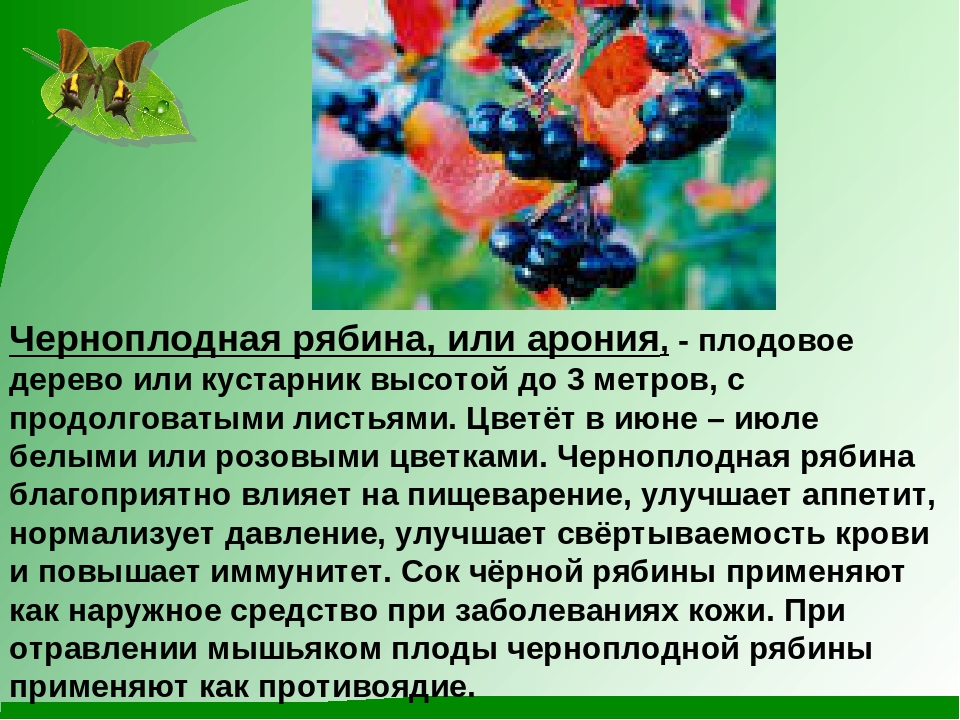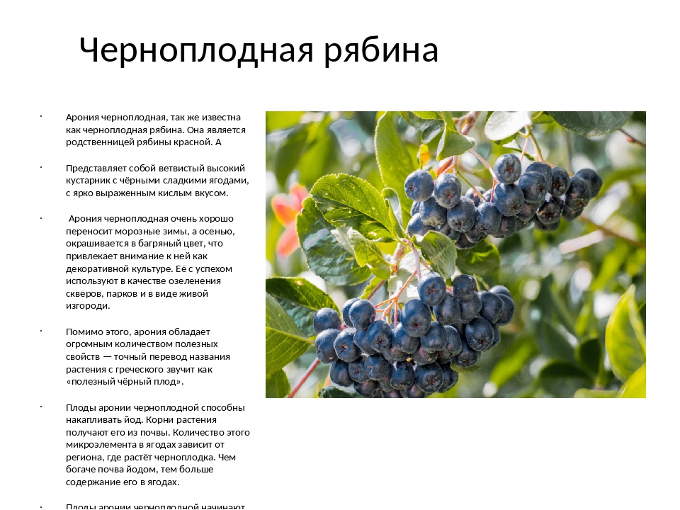 Арония — Это многолетний кустарник, который плодоносит на четвертый год после посадки.Плоды имеют сладковато-терпкий вкус, который прекрасно дополняет компоты и напитки. Ягоды рябины способны быстро накапливать в своем составе йод, поэтому считается, что чем ближе растет кустарник к морю, тем больше его содержится.