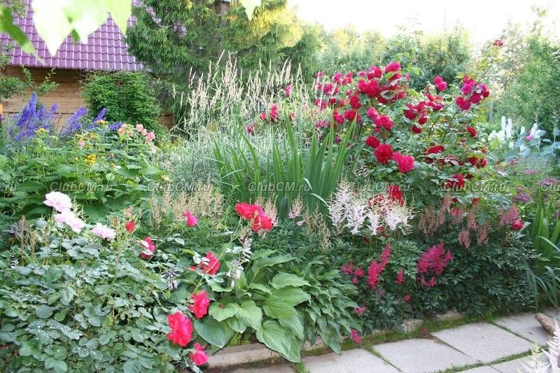 Дачники часто высаживают в саду с розами декоративно цветущие растения.