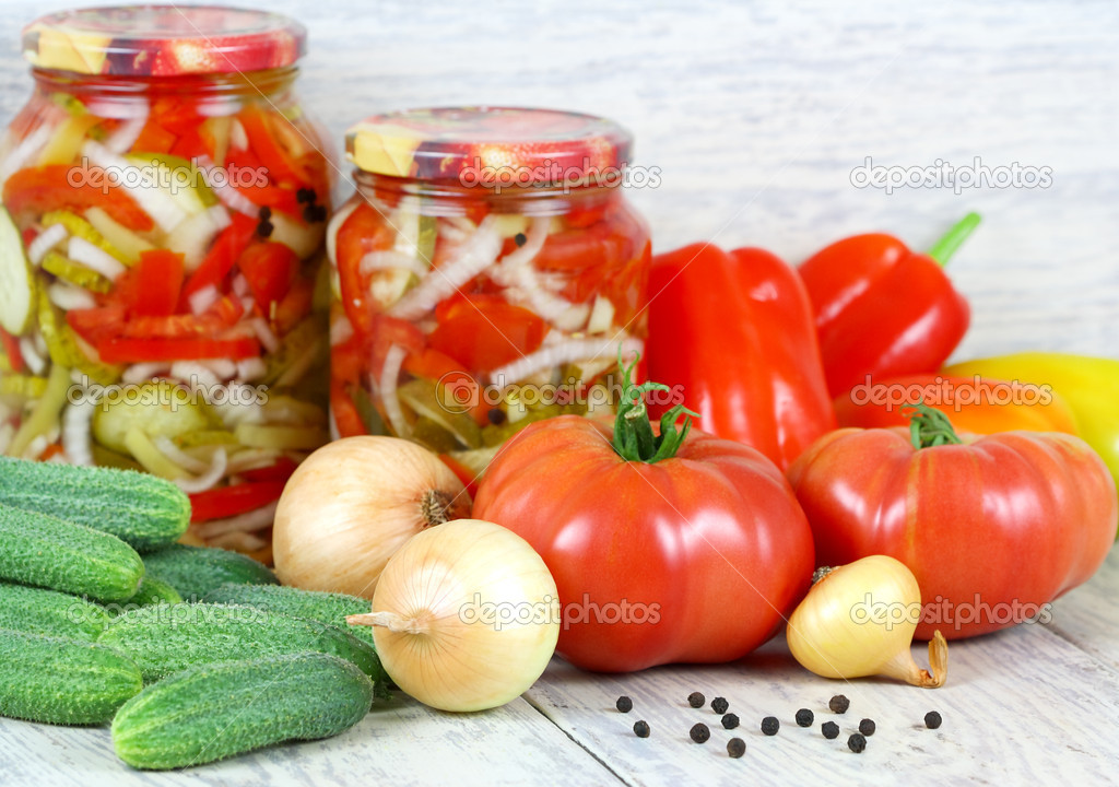 В трехлитровую банку положить укроп, петрушку, 5-6 горошков черного перца, 3 зубчика чеснока, 3-4 кружочка тонко нарезанного кабачка, 2-3 стручка болгарского перца (очищенного от семян), 3-4 корнишона, кусочек свеклы, разрезанную на 4 части морковь, 4-5 небольших помидоров, 200 г нашинкованной белокочанной капусты (можно заменить соцветиями цветной капусты), 4 разрезанные пополам луковицы. Залить горячим маринадом и стерилизовать 10 минут.