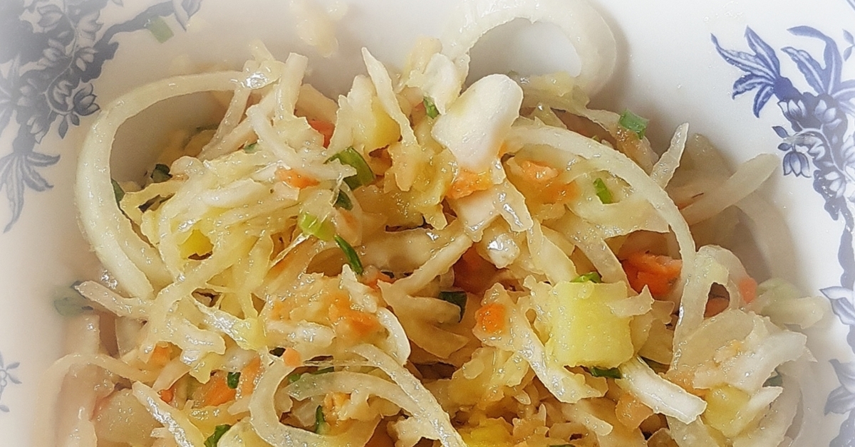САЛАТ «СЕЛЬСКИЙ» ИЗ КВАШЕНОЙ КАПУСТЫ С КАРТОФЕЛЕМ 200 г квашеной капусты 200 г картофеля 1 головка репчатого лука 3 ст.