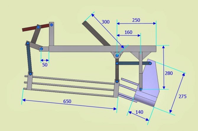 Картофелекопалка для мотоблока без грохота своими руками может быть сделана с меньшими усилиями, но по качеству работы она уступает грохотной. Она вместо горизонтального лемеха использует такой, который по форме напоминает лезвие лопаты, к которому приварены идущие назад и вверх металлические прутья.