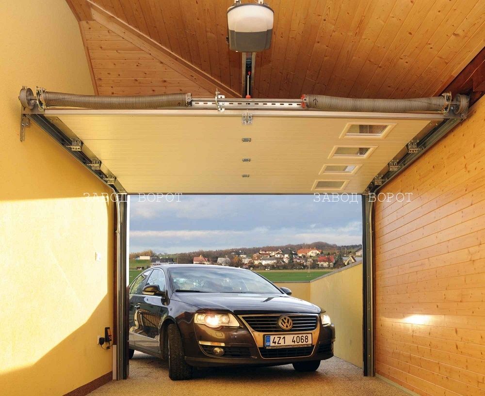 Секционные ворота состоят из секций, соединяющихся петлями. По краям проема прикреплены шины, которые заходят под перекрытие. Именно по ним движутся секции. Когда гараж открывается, они, сворачиваясь, размещаются вверху.