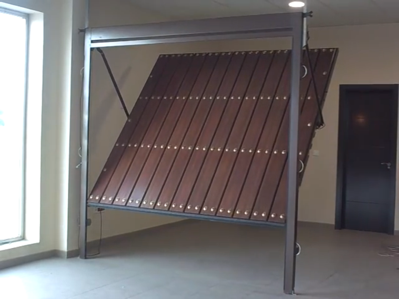 Поворотная конструкция состоит из цельного полотна, которое меняет свое положение с горизонтального на вертикальное. В основе используется система привода и рычагов, которая и создает сам механизм поворота.