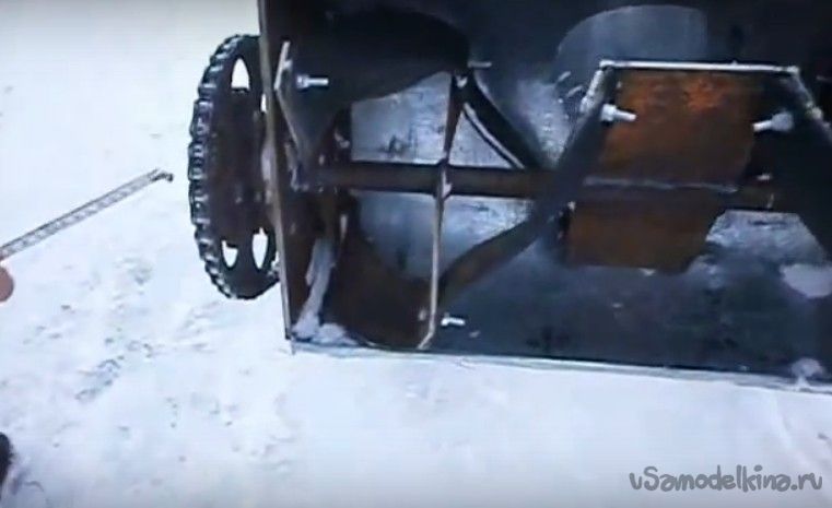 Туннель для отвода снега приваривается к отверстию подготовленному для этого процесса. Лопатка монтируется снизу. Редуктор необходимо укрепить с помощью болтов, а ротор будет создан с помощью ножа триммера.