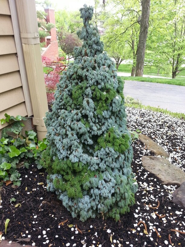 Этот синий цвет растения является переменным. Обычно он начинается очень синим в молодом возрасте и становится зеленым по мере взросления. На старых растениях он создает приятный эффект гобелена между синей и зеленой хвоей.