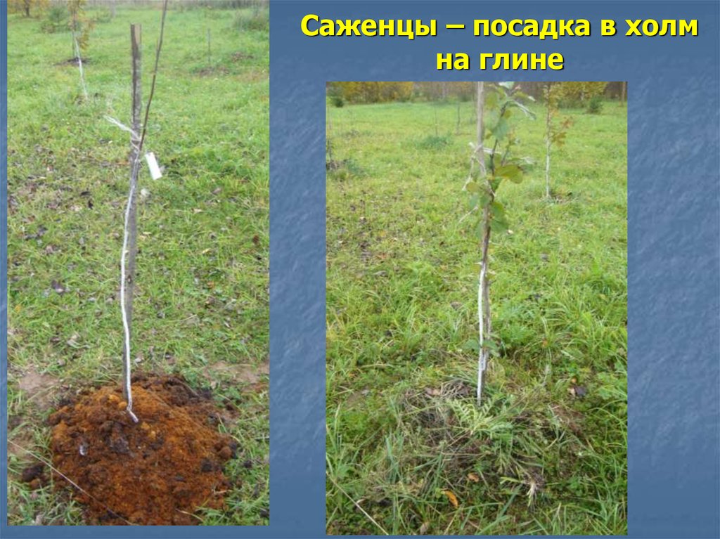 Кроме того, лучше привезти растительный грунт на тяжелые глинистые земли и делать посадку саженцев на холмик высотой 0,5-1 м и диаметром 3 м. В условиях близкого залегания грунтовых вод или возможного накопления талых дно посадочной ямы бетонируют, чтобы главные вертикальные корни приняли горизонтальное положение.
