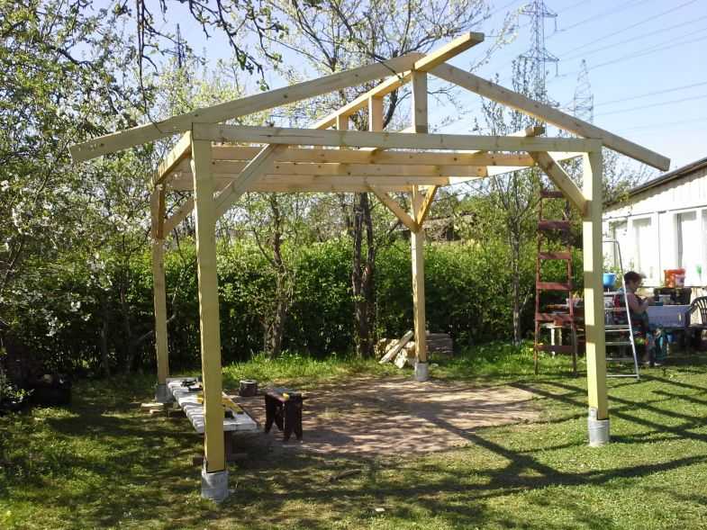 Совет: Если вы бетонируете площадку до того, как сделать навес на даче, заложите сразу проемы под стойки. И подумайте над отводом воды с кровли — не пойдет ли она под навес? Всю древесину стоит обработать водоотталкивающим составом и антисептиком.