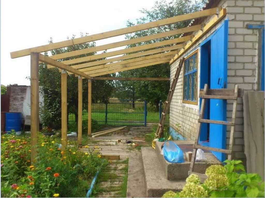 Для того чтобы сделать небольшой (2-3 м) навес, пристроенный к дому, будет достаточно двух опорных стоек, а для шестиметрового понадобятся три-четыре с шагом в 120-150 см.