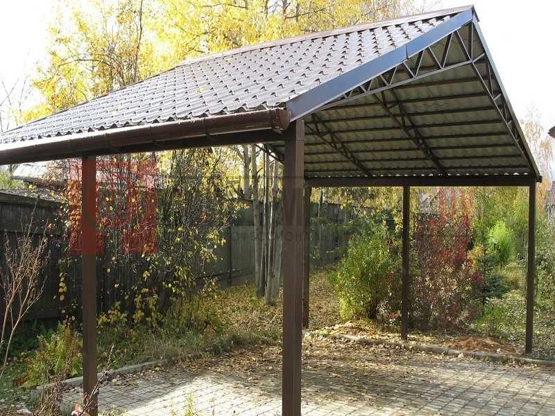 Чаще всего в качестве опорных стоек используют металлоконструкции — столбы (трубы) 100Х100, 80х80, 40х100, 40х40 мм (последние два вида — и на стропила тоже). Планируя, как построить навес, необязательно выбирать одинаковые опоры: одни могут быть основными, потолще, а другие — дополнительными, потоньше.