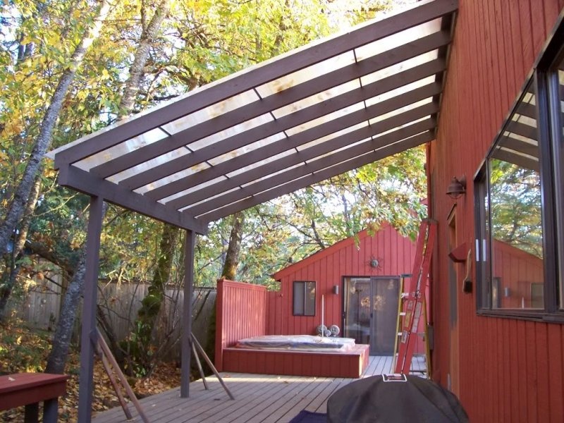 Поскольку это мероприятие изначально подразумевает небольшой бюджет (с большим не было бы нужды интересоваться, как построить навес к дому своими руками), остановимся на двух недорогих материалах — металлопрофиле и поликарбонате.