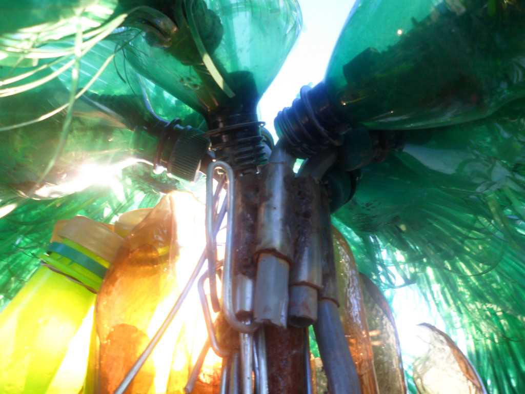На последнем этапе производится соединение всех деталей. Для установки конструкции надо отнести заготовки в выбранное место и аккуратно разложить их, особенно листву, которая находится на веревке — надо постараться не рассыпать ее. Четвертый этап, как сделать из пластмассовых бутылок пальму: