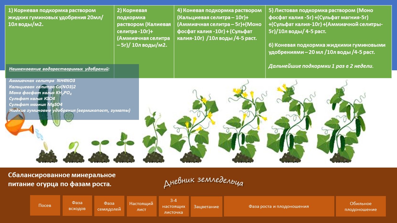 Режим внесения подкормки зависит от сезона выращивания и сорта огурцов (Голландские, Феникс, Меренга).