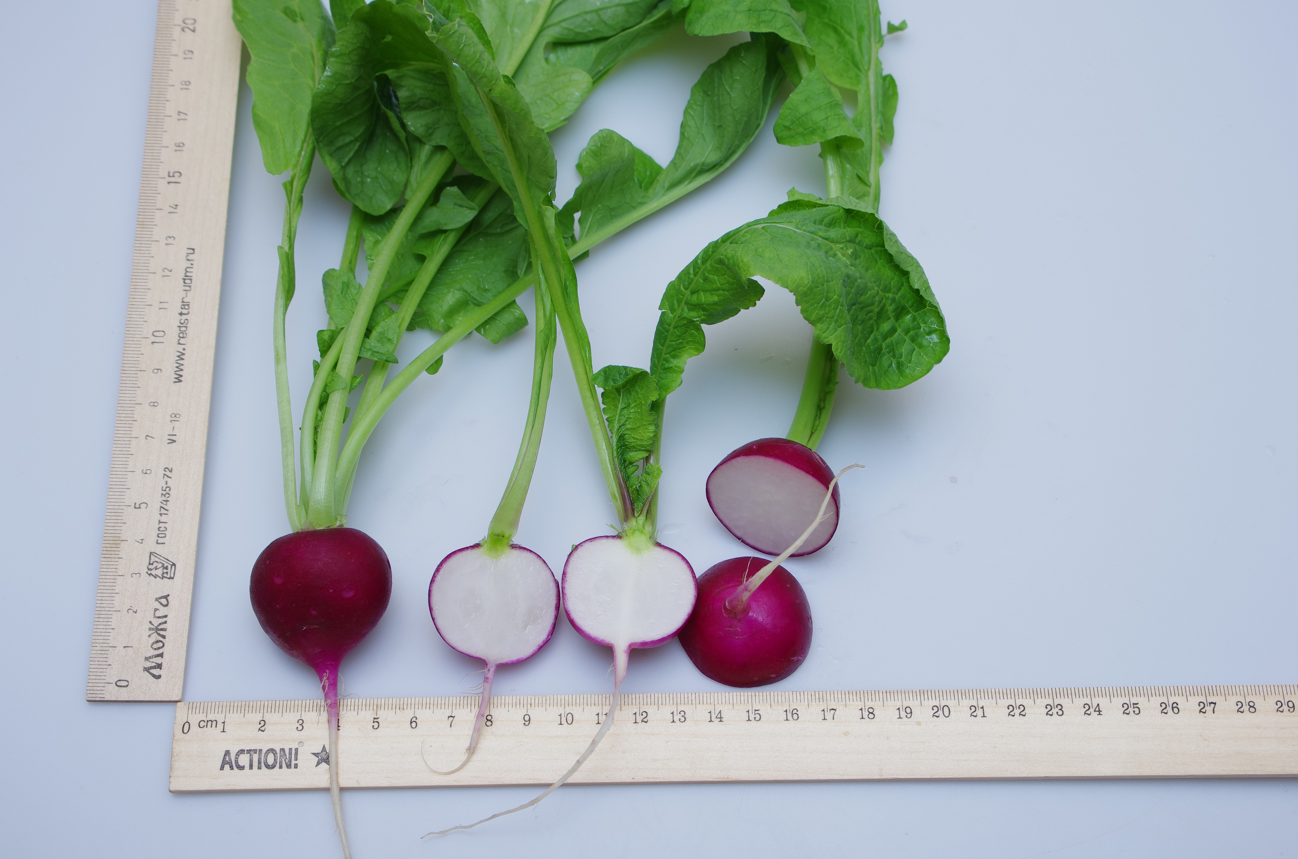 Ультраскороспелый сорт готов к уборке на 17–18 сутки после появления всходов. Корнеплоды вырастают диаметром 2,7–3,5 см и весом 11–16 г. Форма округлая, кожица темно-малиновая, мякоть аппетитная, нежной структуры, наполнена соком с пикантной горчинкой.