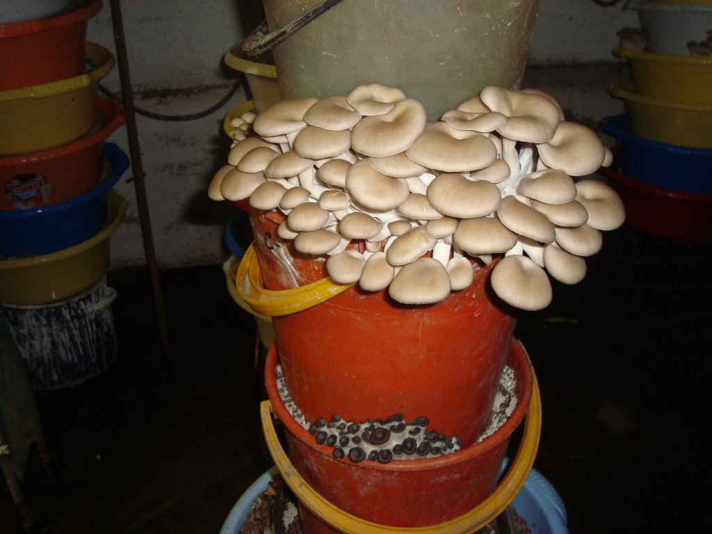 Когда белесые нити проявятся в дырочках, чурки на треть вкапываются вертикально в ведра либо кадки с грунтом для цветов, ткань снимается, температура понижается до 15 градусов. Землю периодически поливают. Плодоношение при таком способе продолжается от трех до семи лет.