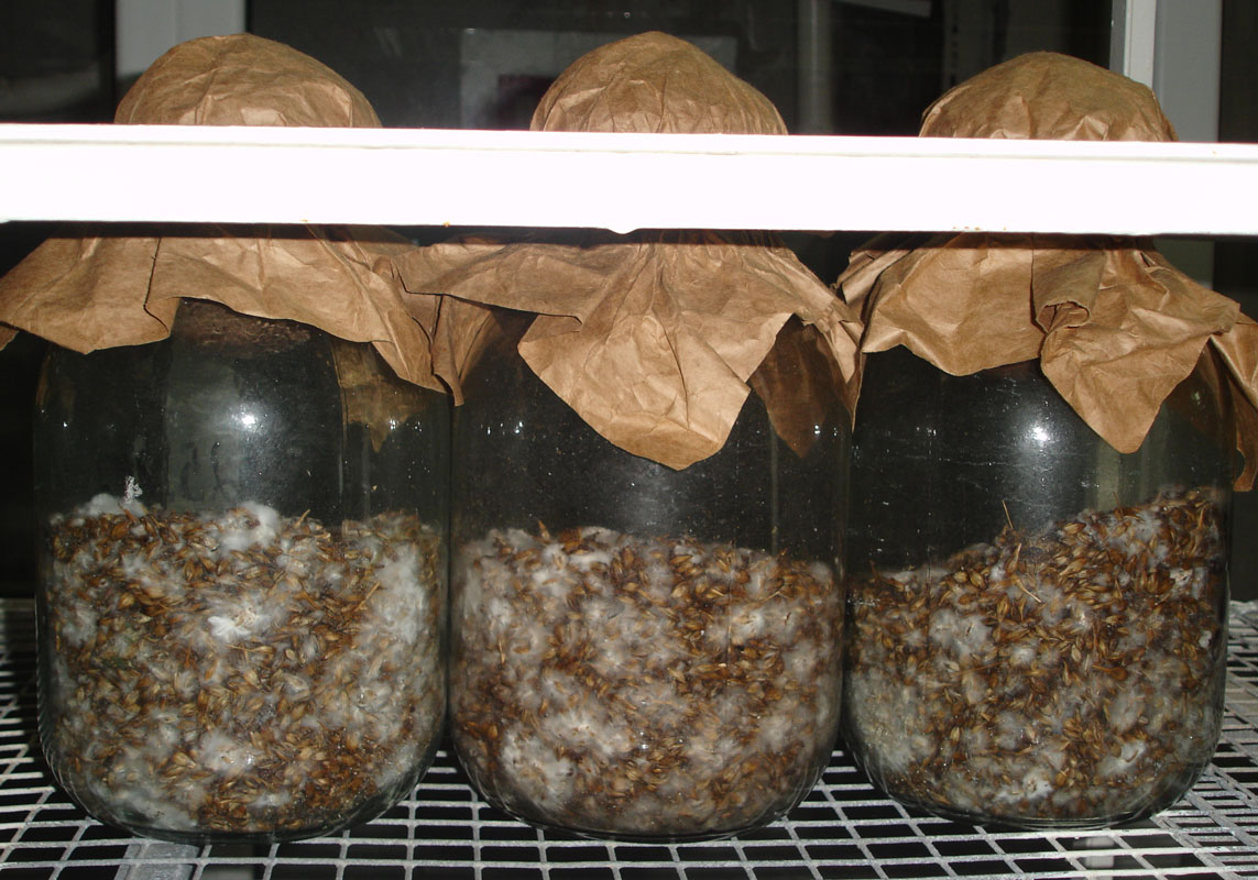 Банки выставляют на подоконник, оборачивают темным материалом или помещают в короба из картона. Мицелию для развития нужна темнота. Марлю на горловинах спрыскивают водой каждый день. С горшочками и контейнерами поступают также, но обматывать марлей их не нужно.