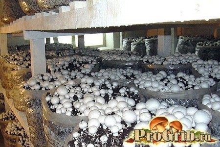 Емкости для грибов устанавливают ярусно на стеллажных полочках. Помимо этого, нет запаха от питательной смеси для шампиньонов, проще регулировать температуру.
