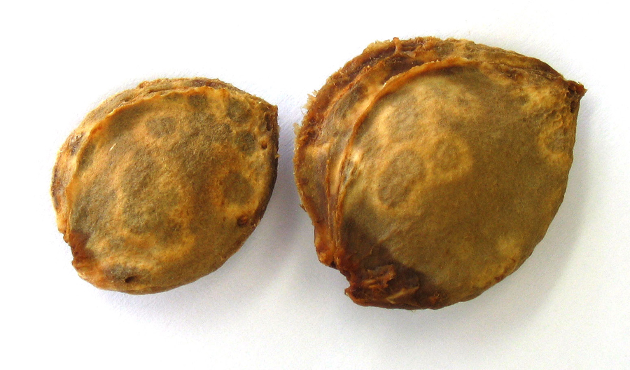 При созревании эти зоны становятся расплывчатыми. Плоды деформируются, на кожице появляются некротические кольца и выпуклости неправильной формы. Некротические зоны конусообразно пронизывают мякоть плода и на косточках формируются отчетливые кольца. В местах поражения мякоть сухая, губчатая, без вкуса[4].