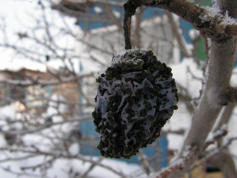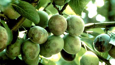 | Кармашки сливы (Тафрина сливовая) | Пораженные плоды разрастаются, не образуя косточки, и остаются пустыми, дутыми. Поверхность поврежденных плодов покрывается мучнисто-белым восковым налетом со спорангиями гриба. | Пораженные плоды не имеют никакой ценности |