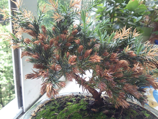 Если все дело в ожогах, залейте дерево теплой водой и обрежьте коричневые веточки в первые теплые дни.