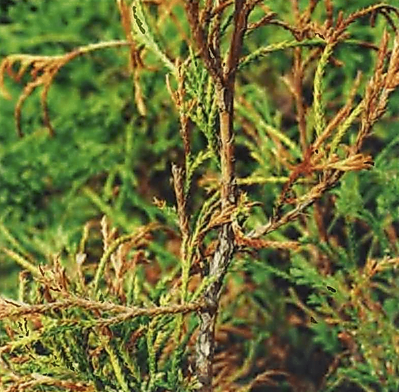 Зачастую туя подвергается этой болезни в самом начале весны. Проявляется недуг постепенным пожелтением побегов и хвои. Если не предпринимать лечебных мер, то со временем побеги станут полностью бурыми и отомрут.