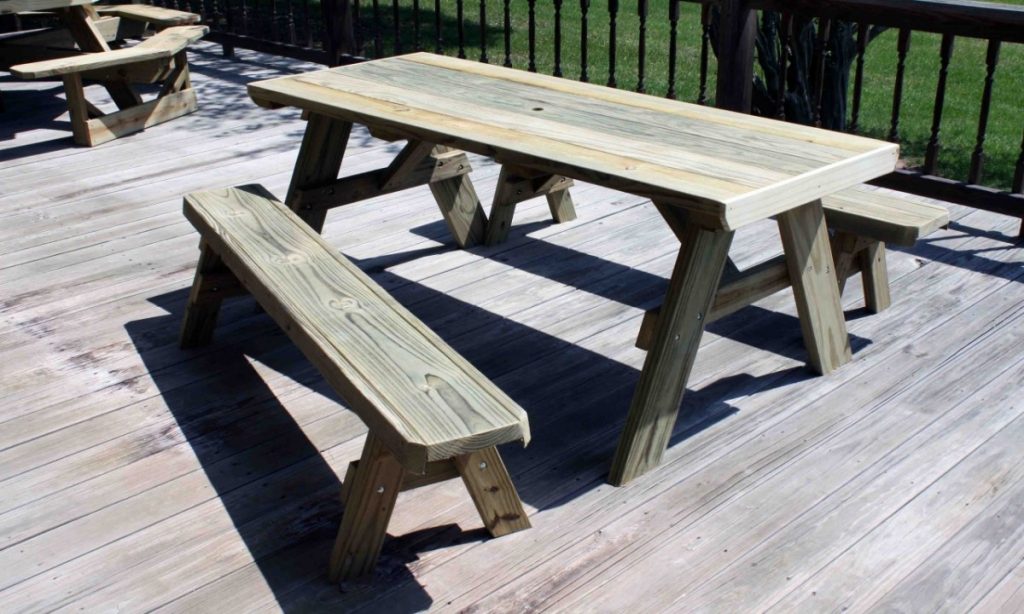 Такая скамейка для загородного дома представляет собой достаточно простую конструкцию, которая может легко трансформироваться в стол с двумя удобными скамейками.