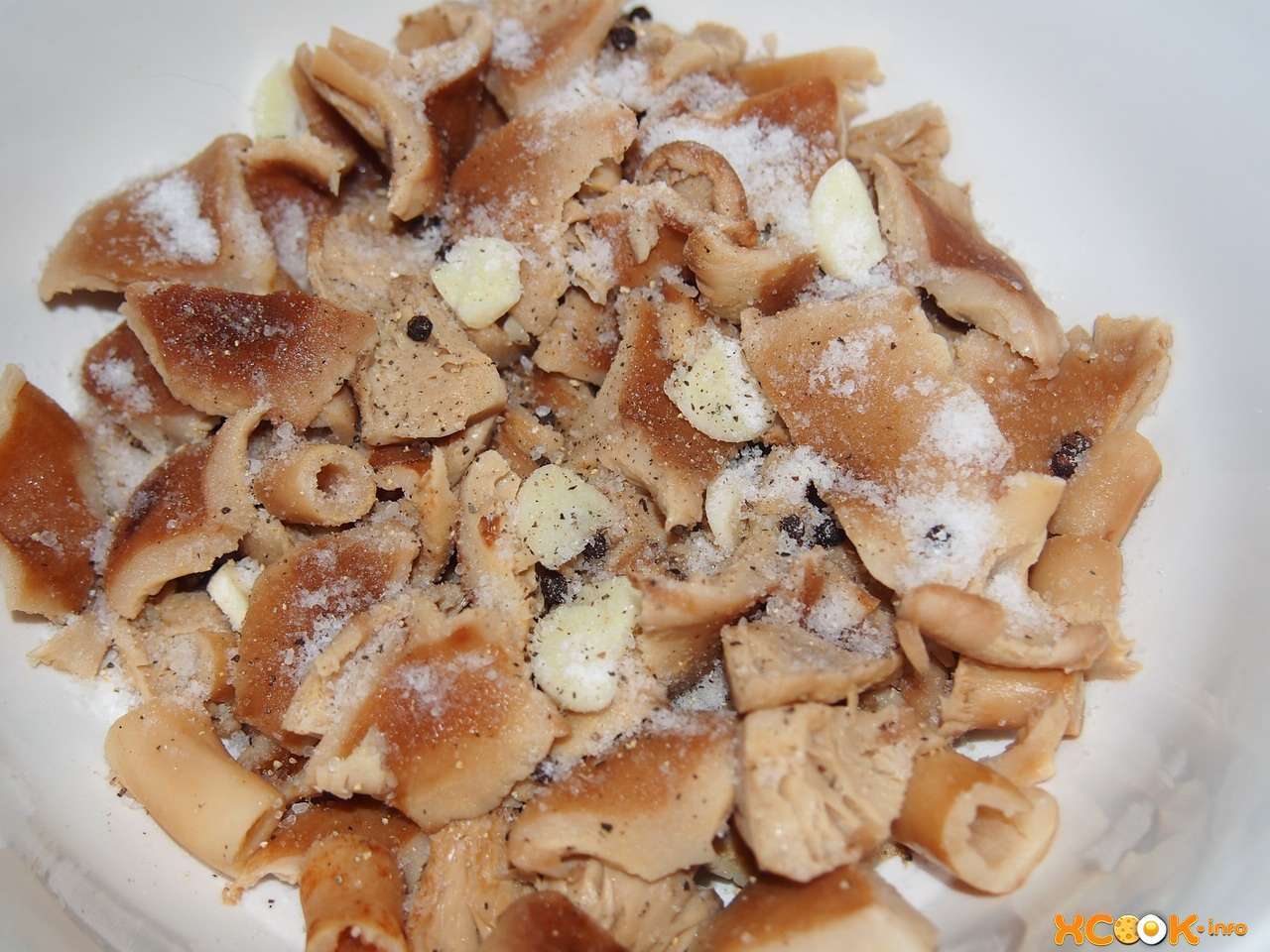 - Почищенные, промытые и нарезанные волнушки вымочить 36 часов в соленной воде.