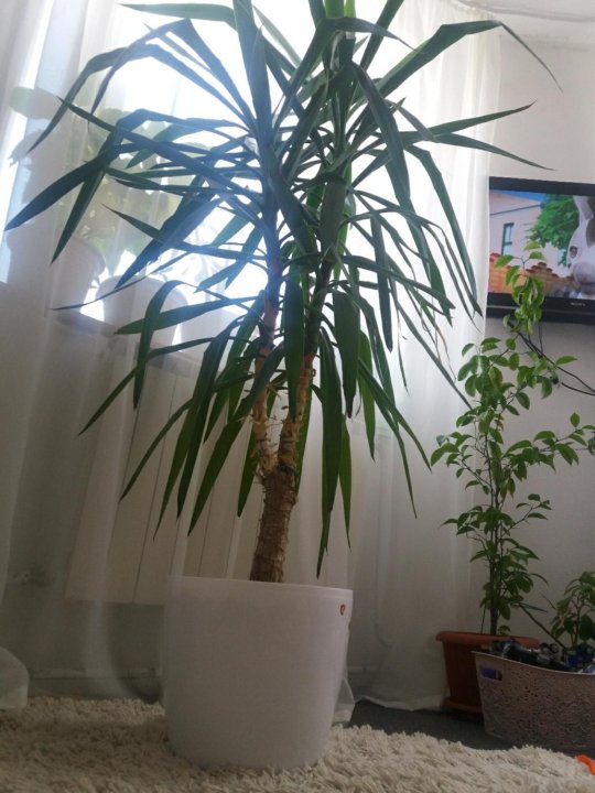 Это крупное комнатное растение, похожее на пальму, подходит для просторных помещений. Юкка прекрасно смотрится как одна, так и в компании с другими цветами.