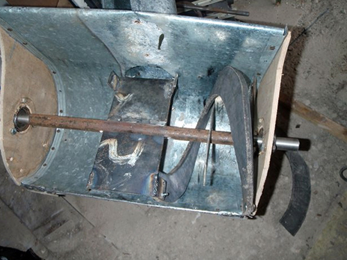 Туннель для отвода снега приваривается к отверстию подготовленному для этого процесса. Лопатка монтируется снизу. Редуктор необходимо укрепить с помощью болтов, а ротор будет создан с помощью ножа триммера.