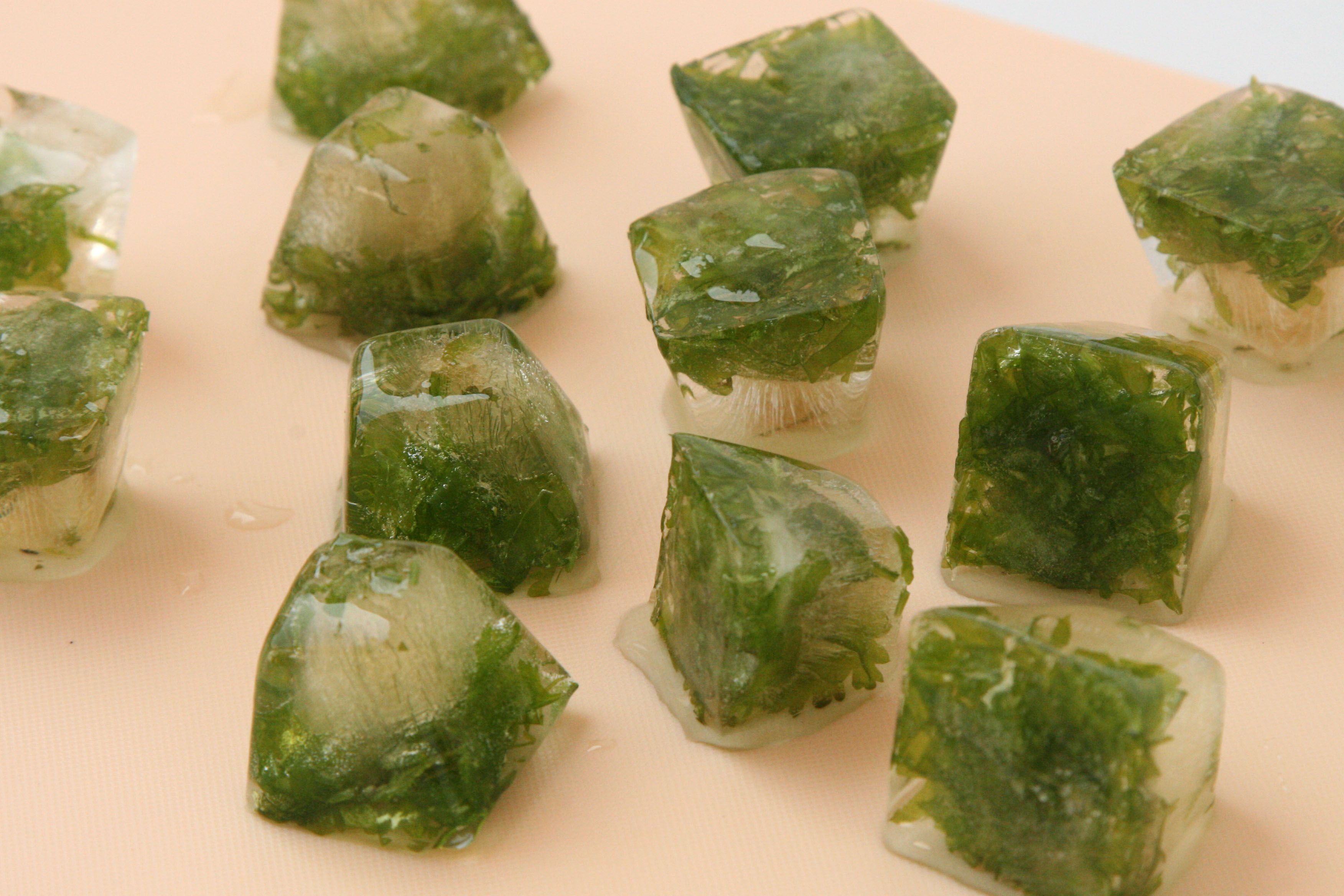Зелень в кубиках льда — это очень удобно. Нужно положить по небольшой щепотке в стандартные формы для льда, залить водой и заморозить. Готовые кубики льда с зеленью складывают в пакетики и хранят в морозильнике. Так удобно не только замораживать, но и использовать: просто достаёте 1-2 кубика льда и кидаете в готовящееся горячее блюдо.
