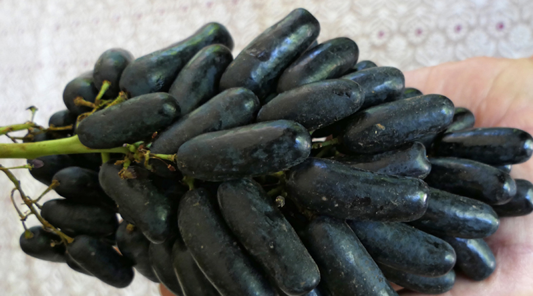 Черные с синеватым отливом ягоды среднего размера, сладкие – содержат до 27% сахара, относятся к 3 классу бессемянности и отличаются высокими вкусовыми качествами. Урожайность с 1 сотки составляет 100-230 кг и характеризуется как высокая.
