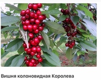 Растет до 2 метров с кроной до 50 см в диаметре. Ягоды созревают к последним числам июня. Они также бордового цвета, невероятно вкусные, сахаристые, десертного типа. - «Сабрина» — самоплодный тип колоновидной черешни. Растет до 2,5 метров. Крона не густая. Ягоды пригодны для сбора к концу июня. Они сочные, большие, мясистые. Дерево имеет устойчивость к холодам, рекомендуется для возделывания в южных областях. Имеет сильный иммунитет к болезням и редко поражается вредителями.