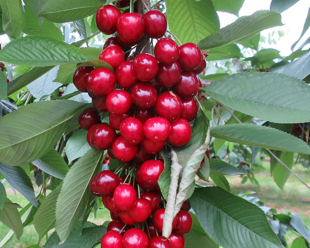 - «Сэм» — ранний сорт колоновидной черешни, рекомендуемый для промышленного выращивания. Первый урожай можно снимать 10 июня! Используется для выращивания обособленно или как опылитель для других сортов деревьев. Ягоды среднего размера, около 12 г, сахарные, с высоким содержанием сока. Дерево способно давать урожай примерно 15 лет.