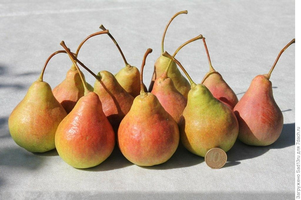 Обладают правильной грушевидной формой. Имеют зелевато-желтый оттенок, который сменяется к концу лета на бордово-малиновые тона. Кожица тонкая, мясистая с сочной мякотью с ярко выраженным сладко-кислым вкусом. Рекомендуется срывать груши, когда слегка недоспевшие, ведь пролежав в помещении пару дней, груша дозревает и сохраняет свои вкусовые качества. При правильных условиях хранения плоды способны не портиться несколько месяцев. Высокая устойчивость к парше и гнили, так же не боится морозов.