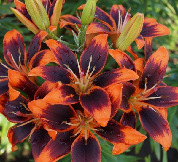 | Азиатские | Самые многочисленные, до 5000. Луковицы небольшие, белые. Цветки в диаметре 14 см, разной палитры, встречаются черно-бордовые, кроме фиолетового и синего. Трубчатой, звездчатой, чашевидной формы, в виде чалмы. Карликовые до 20-40 см и высокие до 1,5 м. Зимостойкие, растут на солнце, переносят тень, распускаются в начале лета, цветут до августа. |