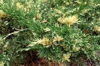 Variegata | Растения представляют собой достаточно компактные стелющиеся кусты размером до 0,8×1,5 м. Ветки косовосходящие, на концах часто изогнутые. Боковые побеги густые, прямостоячие. Чешуевидная хвоя в своей основной массе темно-зеленая, однако на концах веток побеги окрашены в светло-кремовые оттенки – за это сорт часто называют можжевельником пестрым. К тому же хвоя ярко пахнет и обладает обеззараживающими и фитонцидными свойствами. Растение любит хорошо освещенные участки, достаточно неприхотливо к почвам, однако требует регулярного полива и опрыскивания. |
