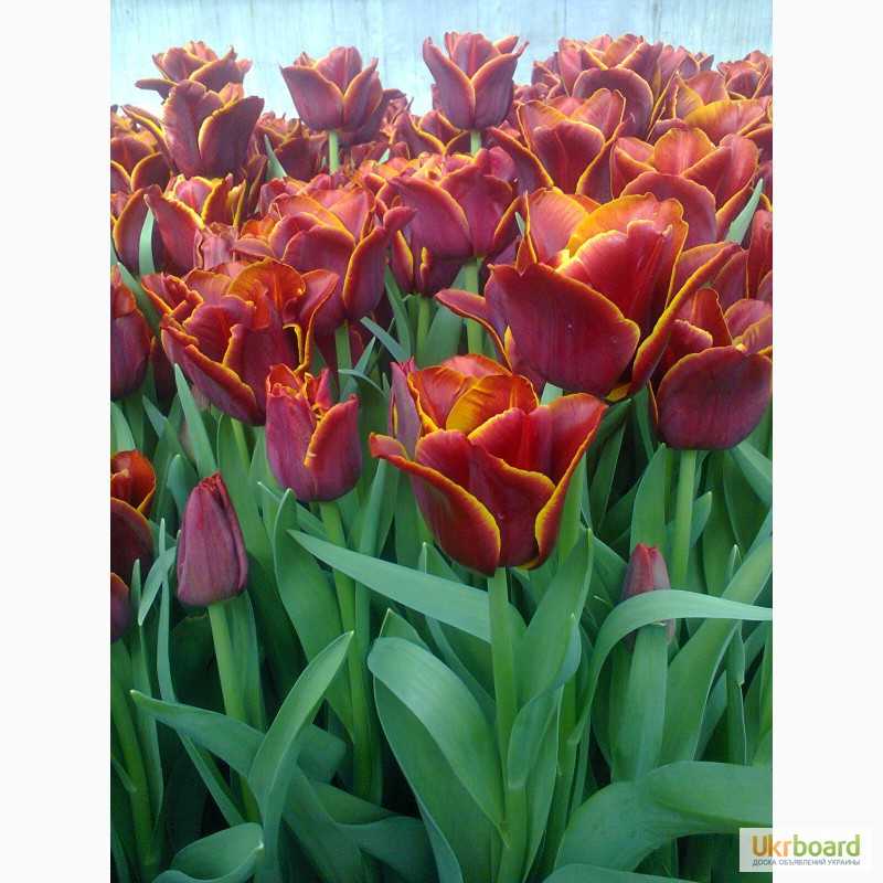 Парад. Ярко – красный крупный тюльпан, в форме бокала. Высота 12 см. Середина чёрная, с жёлтой каймой. Раскрывается под солнцем. Высота цветка до 70 см.