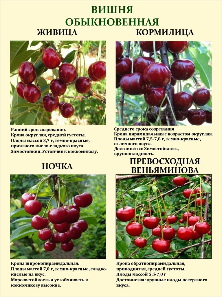 Такие сорта вишни хорошо приспосабливаются к переменчивому климату Сибири и Урала, к тому же отличаются хорошей урожайностью и вкусом.