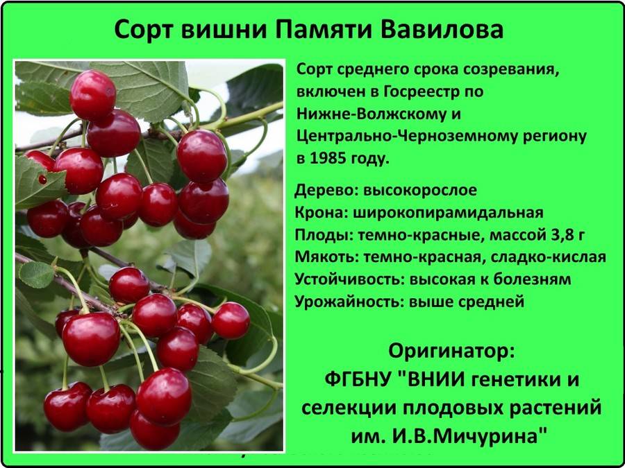 Также существуют другие сорта вишен с ранним сроком созревания. Например, Память, Булатниковская, Еникеева, Багрянка, Сания, Васильевская.