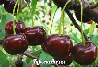 Вишня сорта ТургеневкаДерево вишни такого сорта вырастает до 3-х метров, образует соцветия по 4 белых цветка. Плодоношение происходит на букетных прутиках. Ягоды широко-сердцевидной формы, крупного размера с массой до 6,5 грамм. Цвет кожицы темно-красный, мякоть сочная, кисловато-сладкая, вкусовая оценка нормальная. Первый урожай созревает на 5-6 год жизни, полное созревание плодов наступает в начале июля.