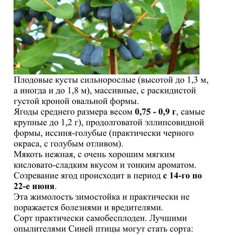 «Синяя Птица» — родственница дикой камчатской жимолости. Селекционирование производилось в Сибирском НИИ. Это раннеспелый сорт, достаточно неприхотлив в уходе и имеет хорошую устойчивость к болезням и вредителям жимолости.