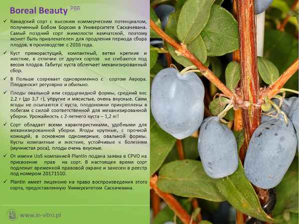 Жимолость раннего периода созревания из семейства Павловской селекции. Он происходит от камчатских дикорастущих собратьев, поэтому обладает достаточно высокой сопротивляемостью к вредителям и болезням.